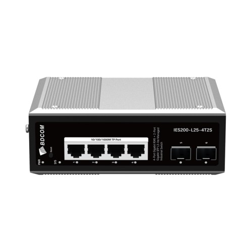 Коммутатор, BDCOM, IES200-L25-4T2S, Управляемый L3-lite, 4 порта 10/100/1000 RJ45, 2 порта SFP, DC 12-55В Dual RPS, вход DC12V, -40+75°C, DIN-rail