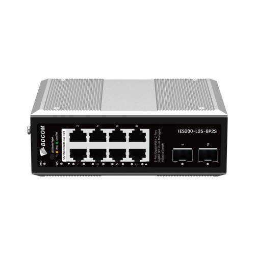 Коммутатор, BDCOM, IES200-L25-8P2S, Управляемый L3-lite, 8 портов 10/100/1000 RJ45, PoE 802.3af/at, бюджет POE 240В (зависит от БП), 2 порта SFP, DC 48-55В Dual RPS, вход DC12V, -40+75°C, DIN-rail, без блока питания